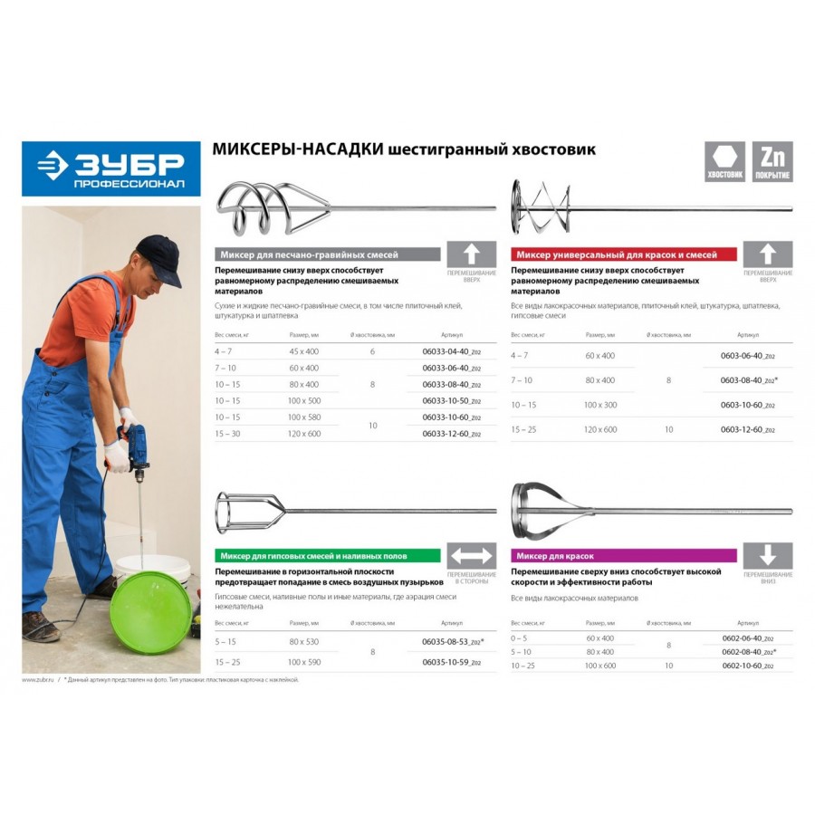 06033-06-40_z02 | Миксер для песчано-гравийных смесей, шестигранный хвостовик, оцинкованный, на подвеске, 60х400мм, ЗУБР ПРОФЕССИОНАЛ