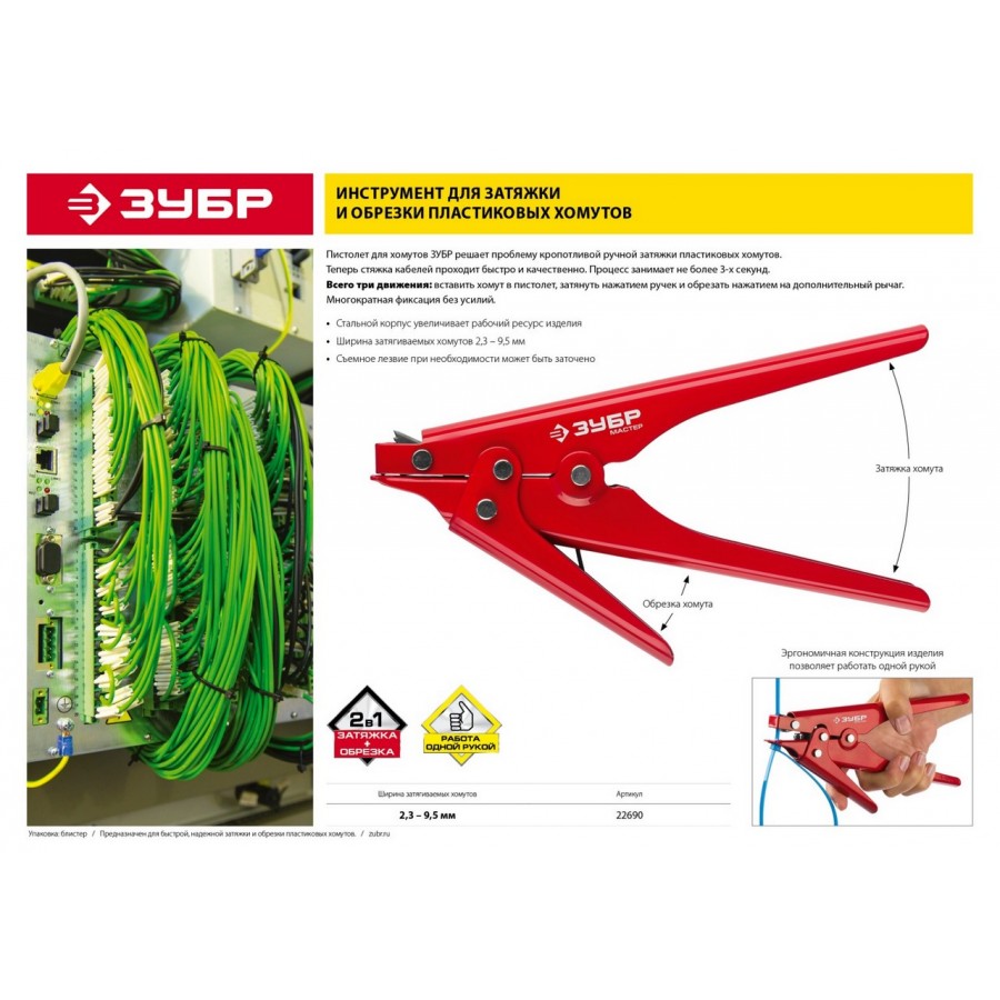22690 | Инструмент для затяжки и обрезки пластиковых хомутов шириной 2,3-9,5 мм, ЗУБР МАСТЕР