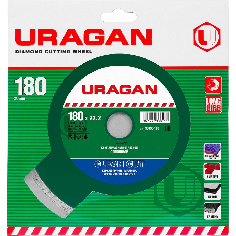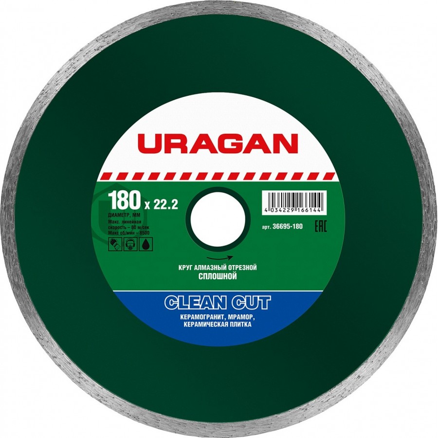 36695-180 | 180 мм, диск алмазный отрезной сплошной по керамограниту, мрамору, плитке, URAGAN CLEAN CUT