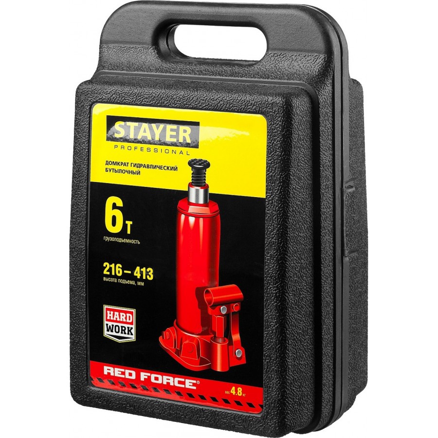 43160-6-K_z01 | Домкрат гидравлический бутылочный, 6т, 216-413 мм, в кейсе, STAYER RED FORCE