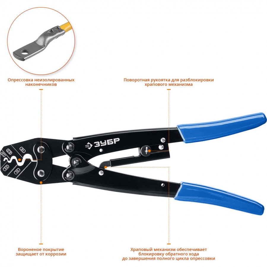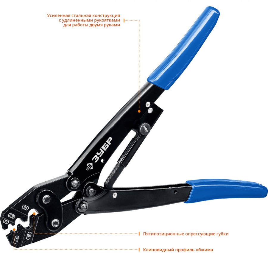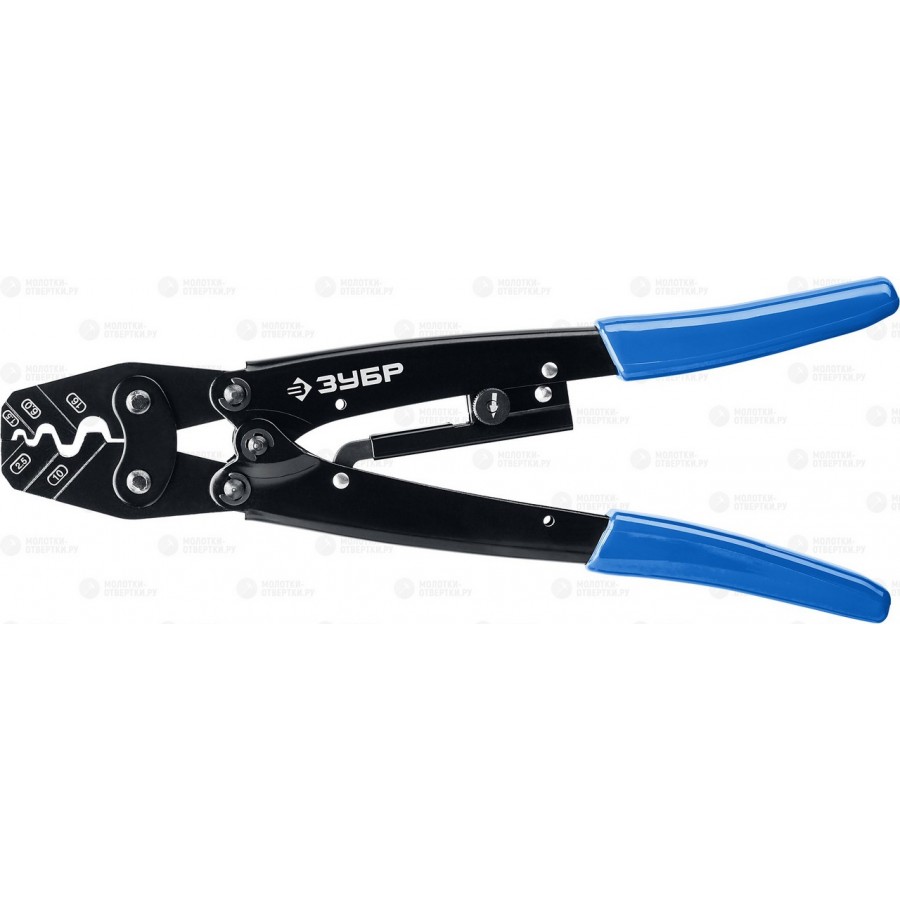 Пресс-клещи ЗУБР 45458, предназначены для опрессовки изолированных и неизолированных кабельных наконечников и штекеров.