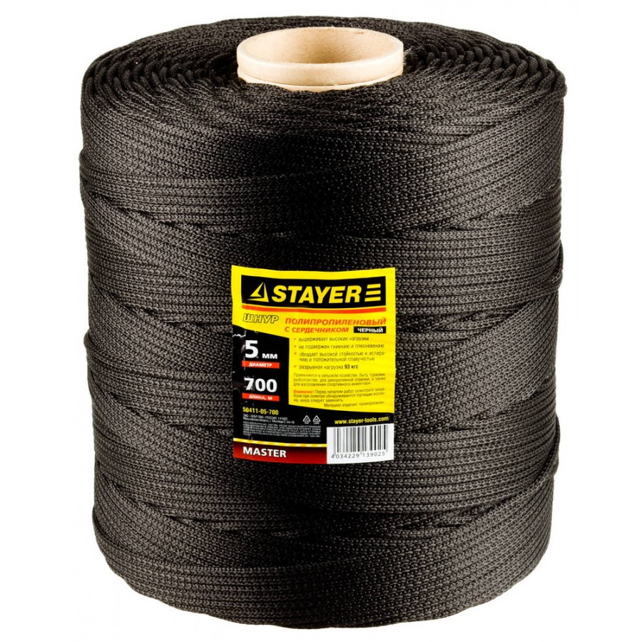 50411-05-700 | Шнур хозяйственно-бытовой, полипропиленовый, вязанный, с сердечником, черный, d 5, катушка 700м, STAYER MASTER