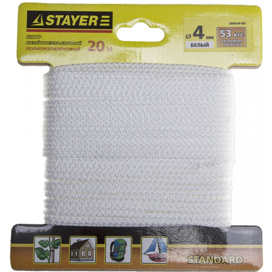 50420-04-020 | Шнур хозяйственно-бытовой, полипропиленовый, вязанный, без сердечника, белый, d 4, 20м, STAYER STANDARD