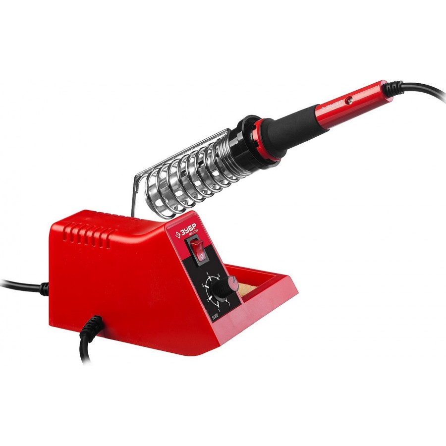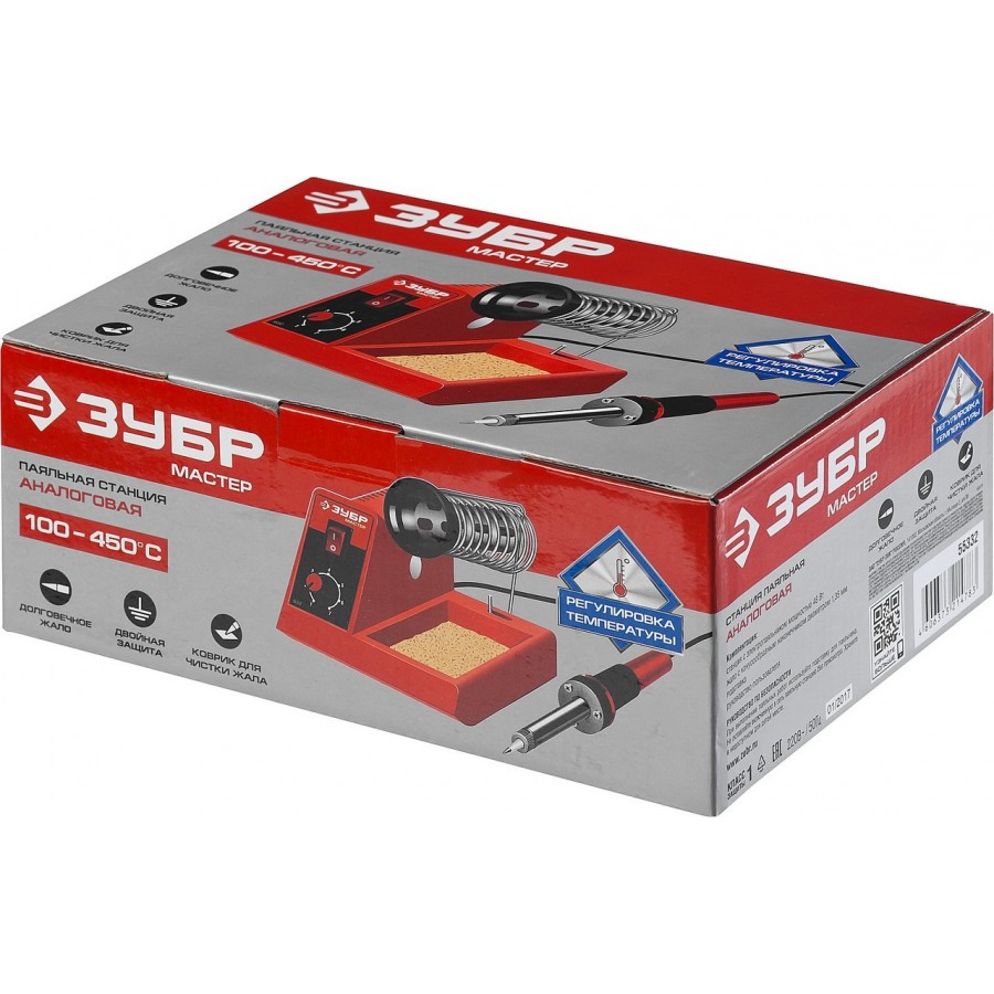 55332 | Паяльная станция аналоговая, диапазон 100-450°C, с подставкой под паяльник, 2-х компонентная рукоятка, 48Вт, ЗУБР МАСТЕР