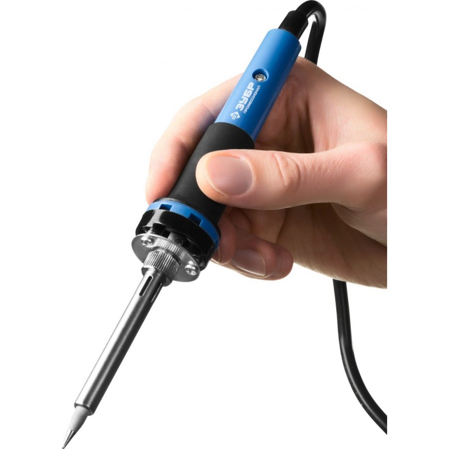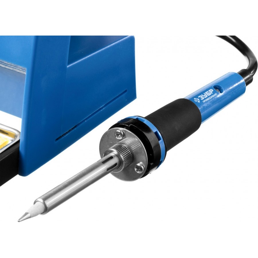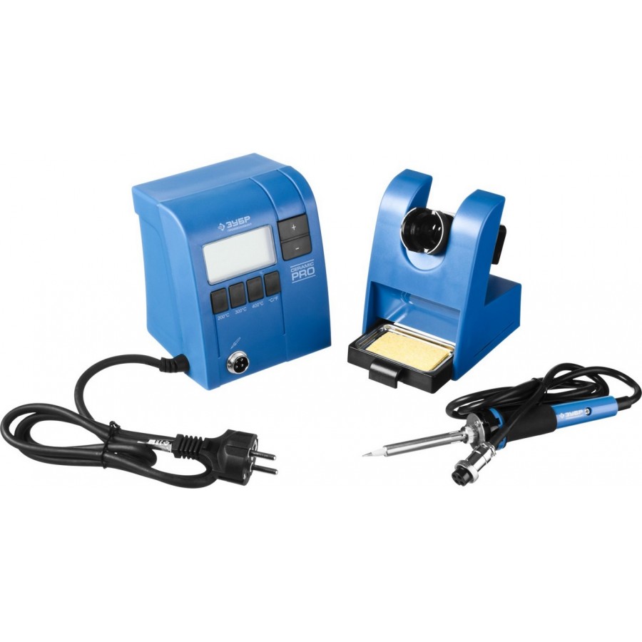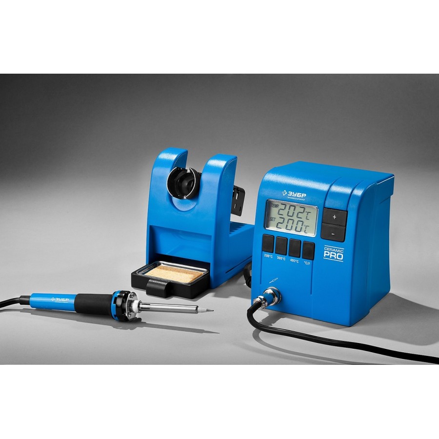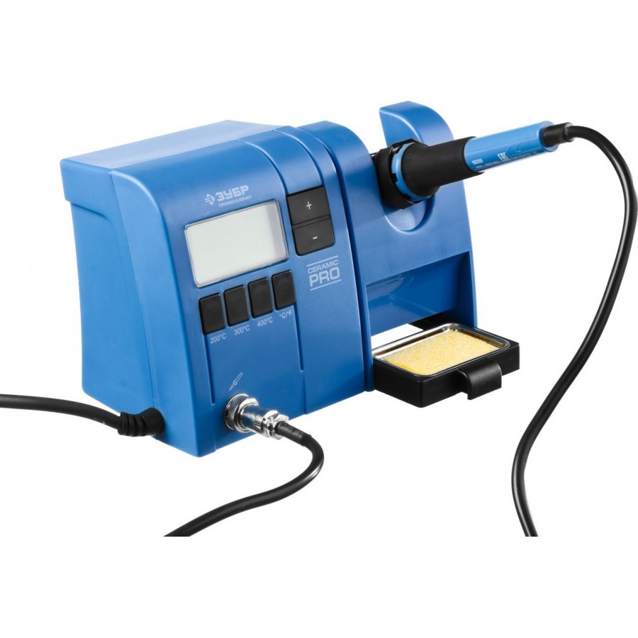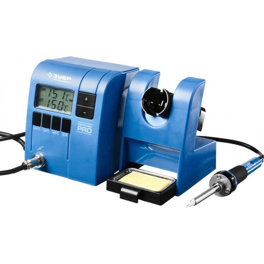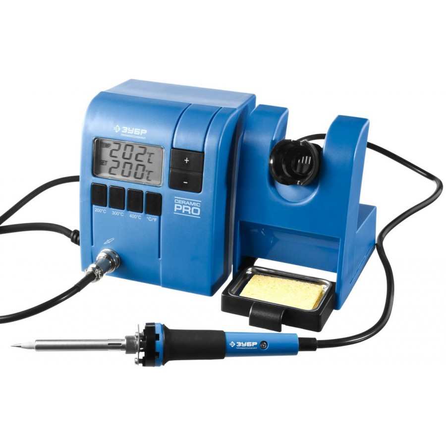 Паяльная станция ЗУБР 55335, применяется для паяльных работ, требующих бережную пайку при определенной температуре. станция ЗУБР особенно удобна при пайке электронных плат и других мелких деталей, поскольку поддерживает заданную температуру и не нуждается в отключении от электросети во время работы. Температура устанавливается с помощью кнопок, отвечающих за увеличение/уменьшение температуры с шагом 1С, а также с помощью кнопок фиксированных температур. На ЖК-дисплее отображается процесс нагревания/остывания и температура жала паяльника. Выключатель обеспечивает удобство эксплуатации паяльной станции. В станции предусмотрен отсек для очистки жала от припоя. Подставка, поставляемая в комплекте, удобна при выполнении паяльных работ и обеспечивает безопасность.