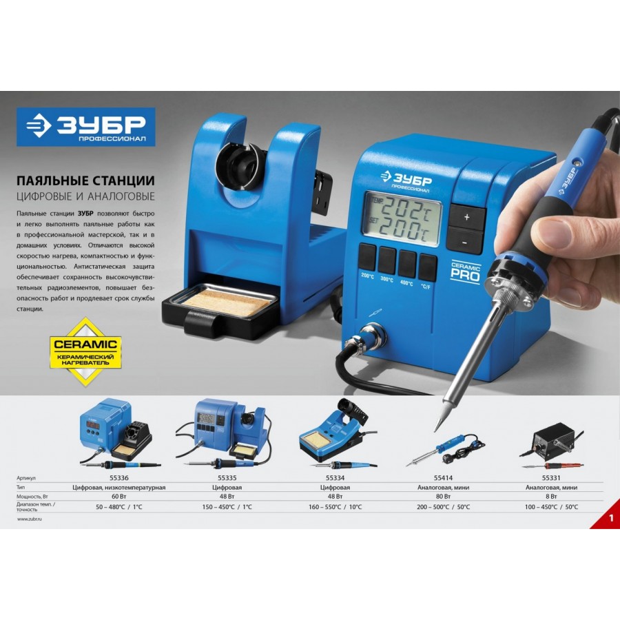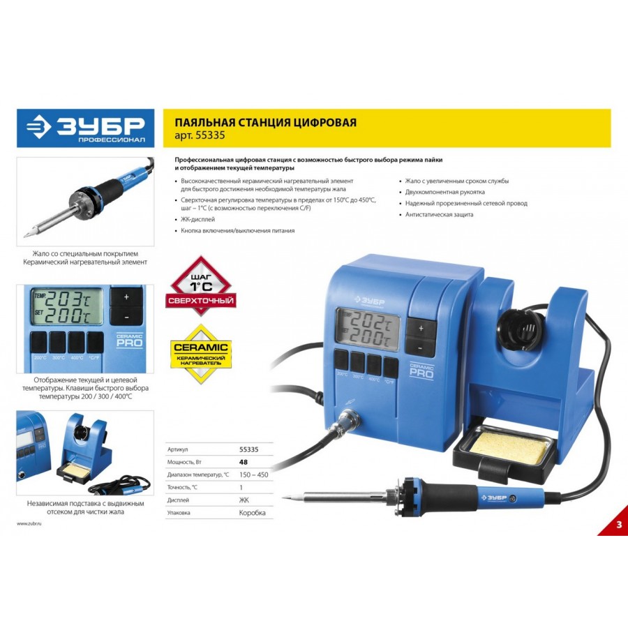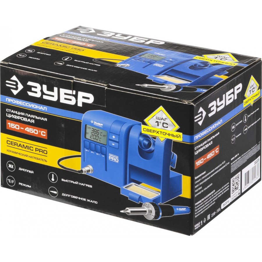 55335 | Паяльная станция цифровая с ЖК дисплеем, керамический нагреватель, диапазон 150-450°C, 48Вт, ЗУБР ПРОФЕССИОНАЛ