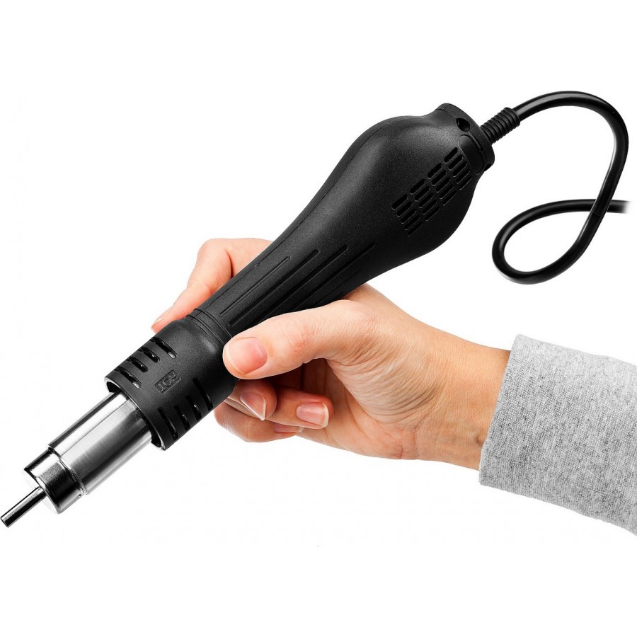 Паяльная станция ЗУБР 55350, применяется для демонтажа и пайки различных видов компонентов в корпусах, таких, как SOIC, PLCC, QFP, BGA используемых при технологии поверхностного монтажа. Технология поверхностного монтажа (или SMT технология) является наиболее распространённым на сегодняшний день методом сборки электронных узлов на печатных платах. Станция сочетает в себе современный дизайн и компактный размер, что позволяет экономить рабочее пространство. Замкнутая система датчиков, микроконтроллер для цифрового отображения данных и контроля температуры, большая стартовая мощность, быстрый разогрев от 3-х до 5-ти секунд, стабильность выбранной температуры. Уникальная функция неактивного состояния позволяет экономить энергию. Когда паяльник кладется на держатель, система приводится в резервное состояние готовности. Как только фен снимается с держателя, система возвращается к установленным настройкам. Уникальная система охлаждения. Продолжительный продув воздухом после выключения прибора продлевает срок его эк
