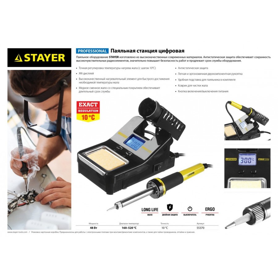 55370 | Паяльная станция цифровая с ЖК дисплеем, диапазон 160-520°C, шаг 10°C, 48Вт, STAYER PROFI