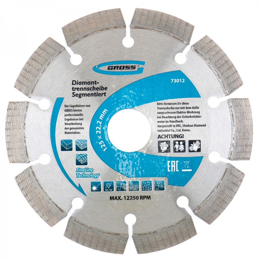 - Алмазный диск размером 115 х 22,2 мм торговой марки GROSS предназначен для резки «сухим методом» (без использования охлаждающей жидкости) изделий из твердых материалов: бетона, мрамора, шлакоблоков и гранита.