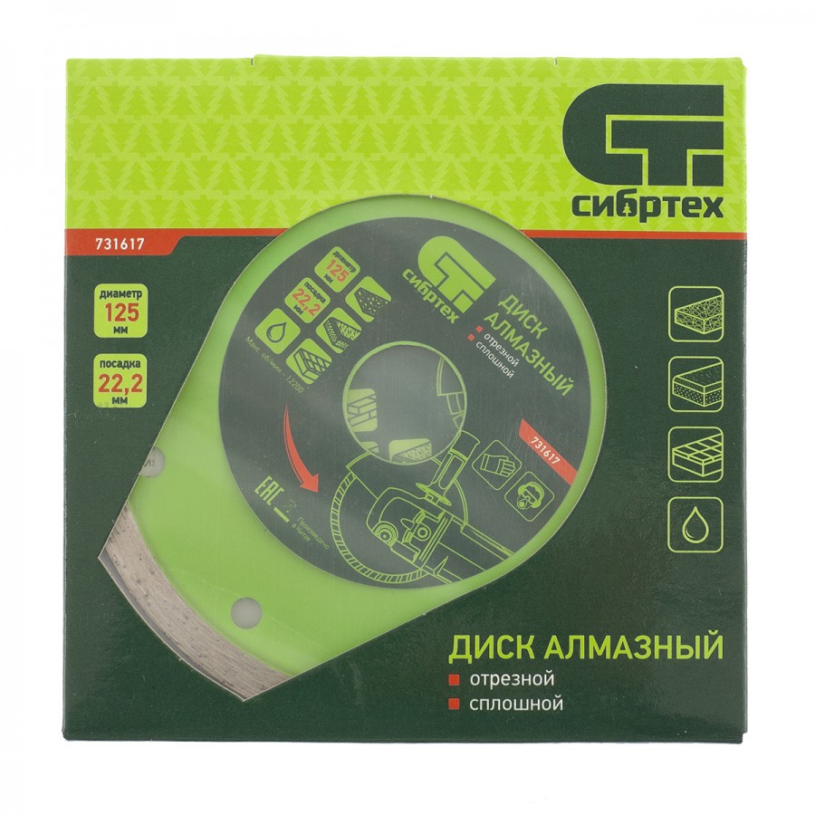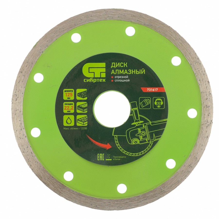 731617 | Диск алмазный, отрезной сплошной, 125 х 22,2 мм, мокрая резка, СИБРТЕХ