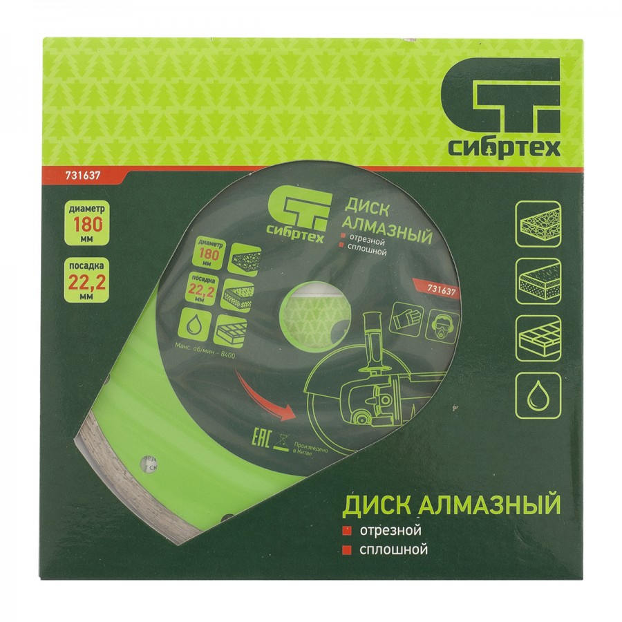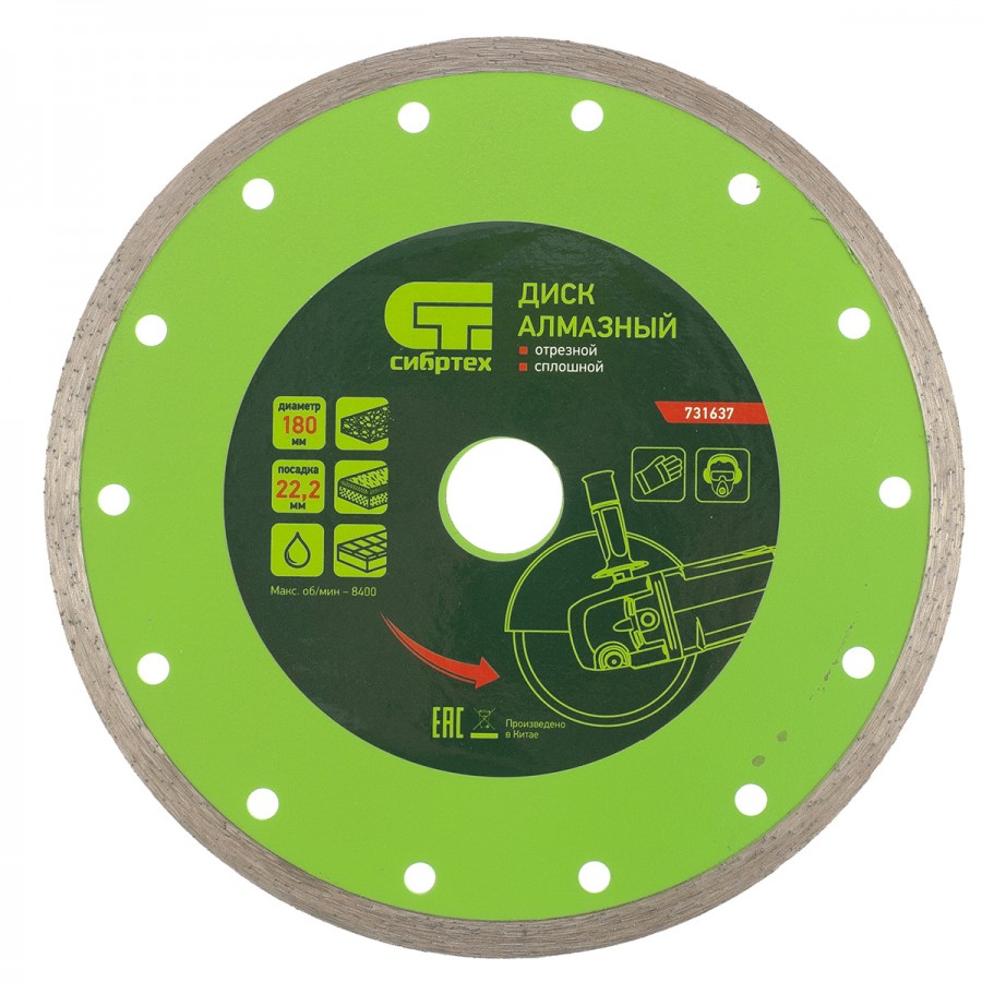 731637 | Диск алмазный, отрезной сплошной, 180 х 22,2 мм, мокрая резка, СИБРТЕХ